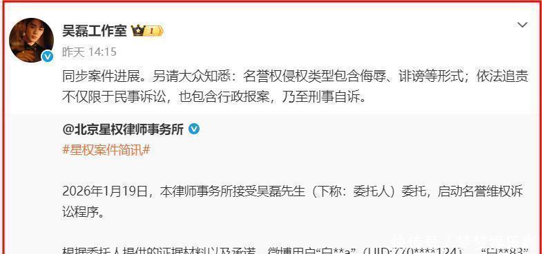 还没等她道歉呢,吴磊工作室就转发了律师声明,明确表示会依法追究责任,声明中直说追责不光是民事诉讼,还包括行政举报,甚至涉及刑事自诉。