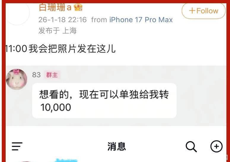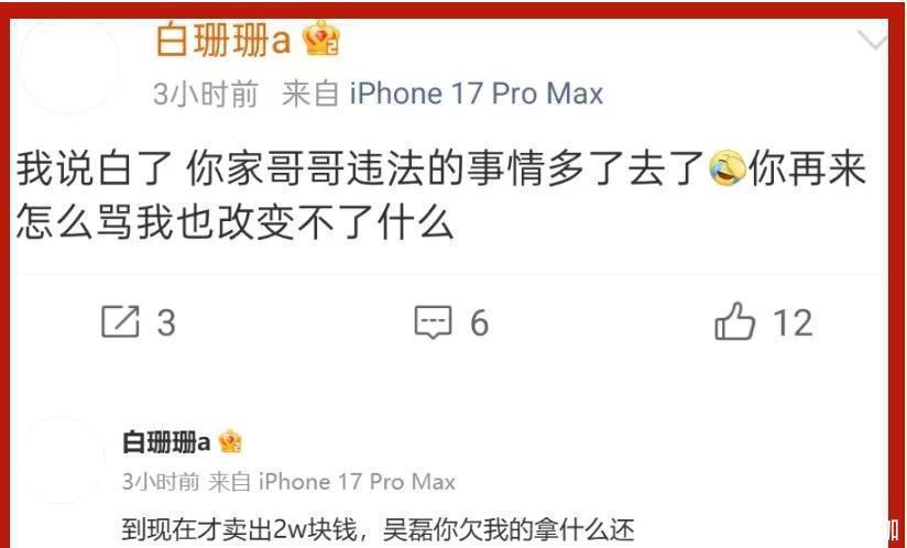 更令人震惊的是白珊珊居然说自己手里有吴磊的床照,还扬言要拿一万块卖给网友。更不可思议的是,白珊珊居然组个群卖吴磊的床照,还说自己卖了2万元,并对吴磊喊话:“你欠我的,用什么还。”