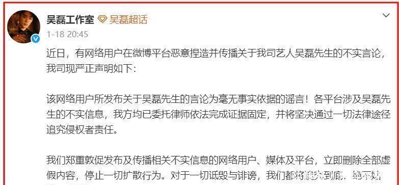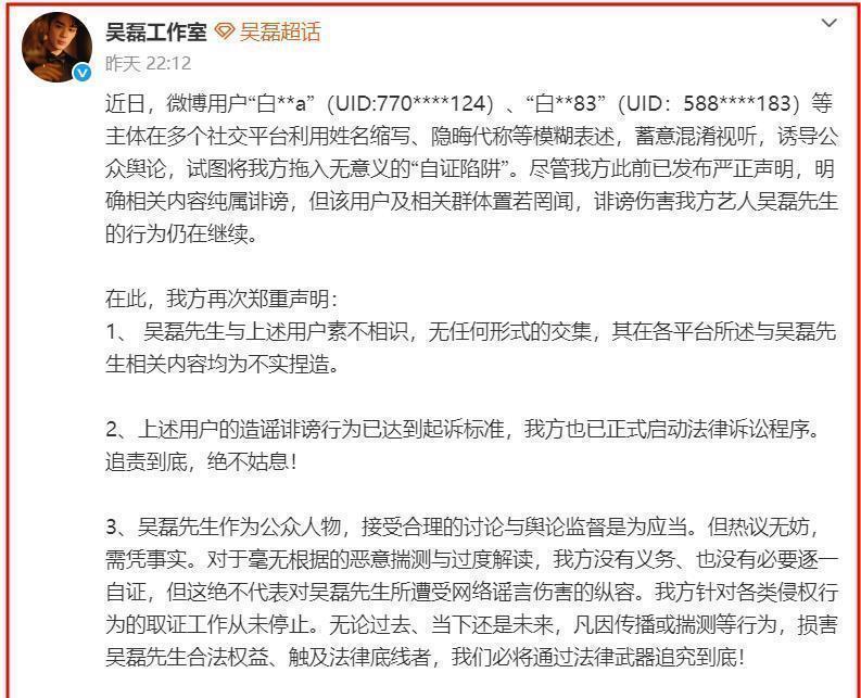 这就意味着,一旦吴磊在官司上占了上风,白珊珊可不只是赔付赔偿、说声对不起那么简单,她还可能会面临入狱的风险。而且,转发完律师的声明后,吴磊的工作室又推出了一份新的声明。