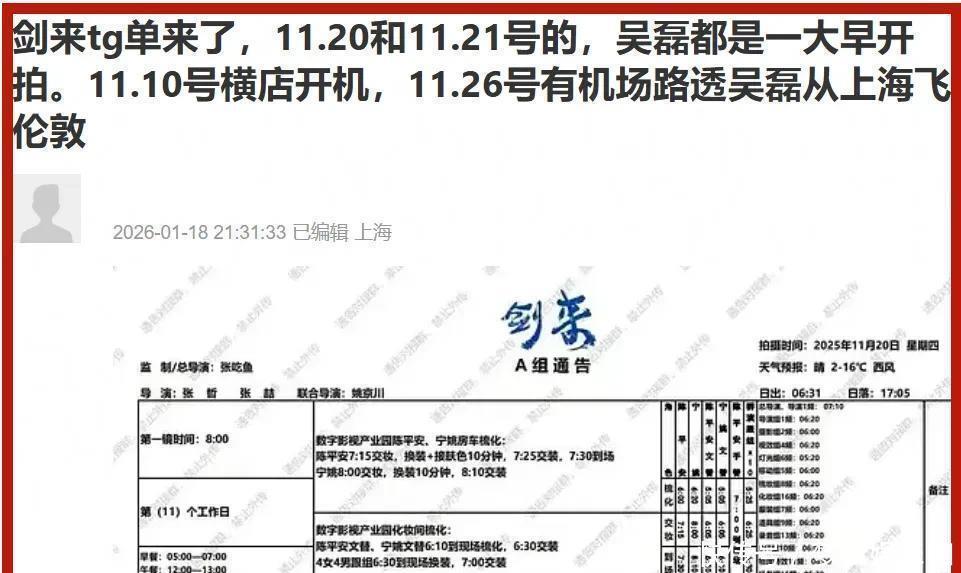 关于白珊珊暗指吴磊去年11月20号在澳门玩乐一事,粉丝们晒出当日吴磊的剧组通告,显示他那天还在《剑来》剧组拍戏,根本就没有去澳门嘛。