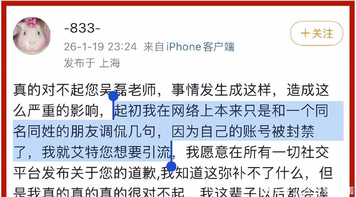 她提到自己艾特吴磊,是为了吸引更多的关注和流量。她表示愿意在各种平台上向吴磊道歉。为了规避法律的追究,她还编了个借口,说自己之前只是开玩笑,对一个和吴磊同名同姓的朋友说了点玩笑话。她的道歉时间也太靠后了,而且投降的心意也不怎么真挚。提醒一下,等她道歉完毕后,白珊珊的小号直接被封了,成了永久禁言。